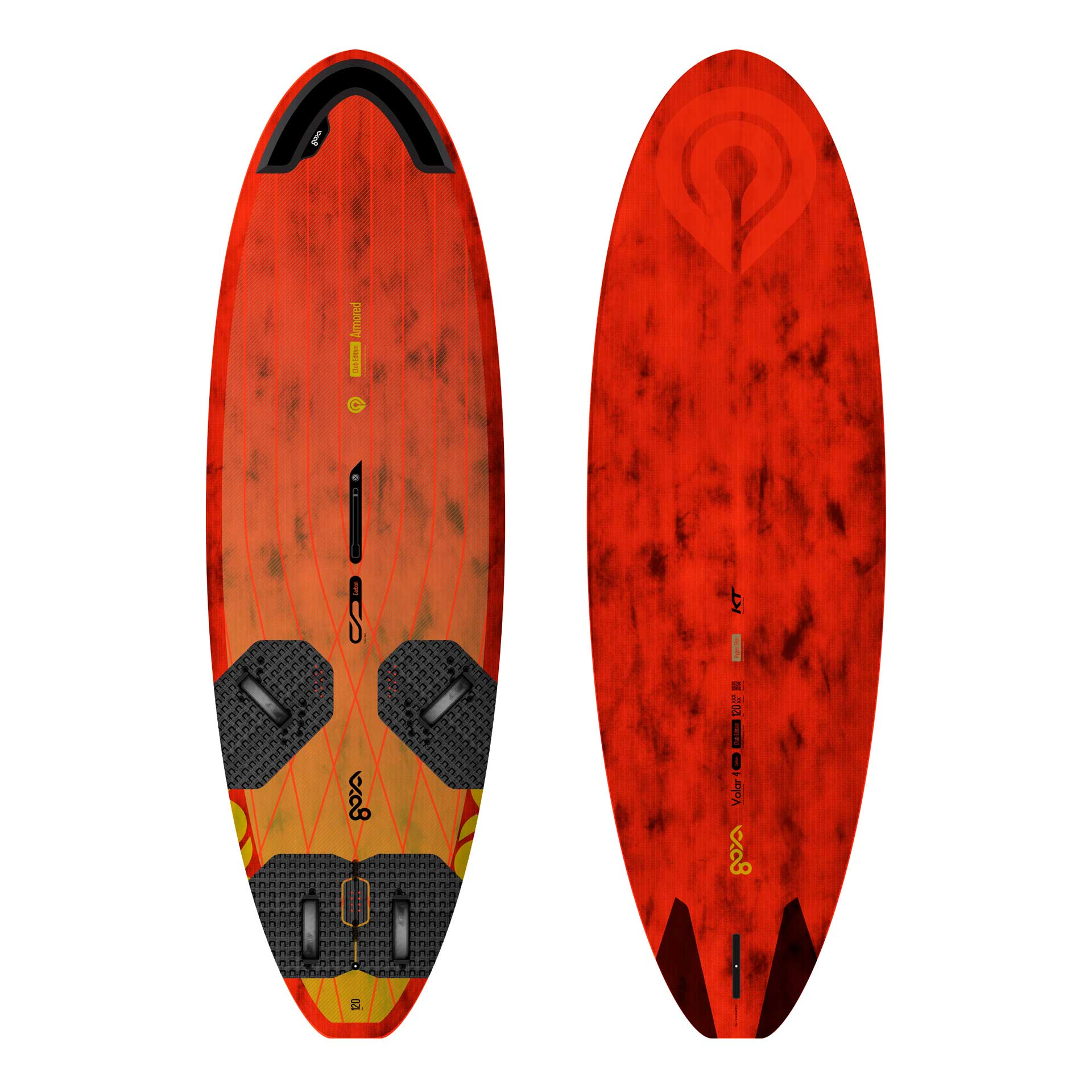 Carbon Club Edition. Freeride. Introducing the Volar Carbon Club Edition: The board to enjoy the greatest sport on earth. Available in 110, 120, 130, 145, 160 liters. CNC milled Masters. Hand-built Carbon Construction. Full Carbon Deck. Hyper Skin™ full top & bottom HD Sandwich. Vacuum Lamination. New Quatro® Ultra Light Mast Box. New slanted dual footstrap inserts. Tuning range: Outboard Back or Inboard Front. Freeride or Trainer. New KT Foiling® Single-to-Dual Density Pads. New MFC® Footstraps. Single Power Box Fin System. New MFC® Liquid Pro Fin. Red Tech-Reveal™ finish over Carbon and Yellow gradient artwork.